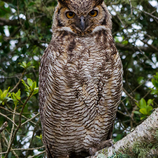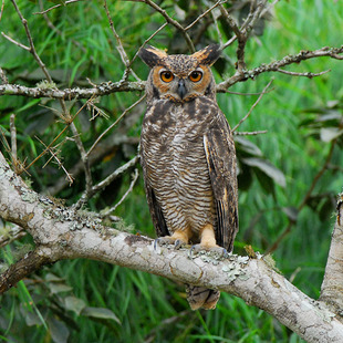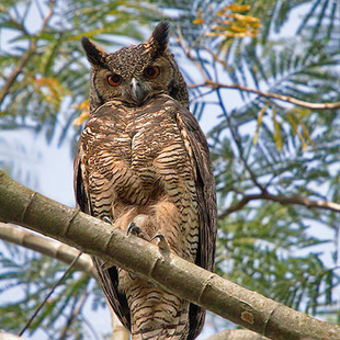 Coruja grande e poderosa, com “orelhas” proeminentes. Maior rapinante noturno das Américas, também conhecido como João-curutu e Corujão.