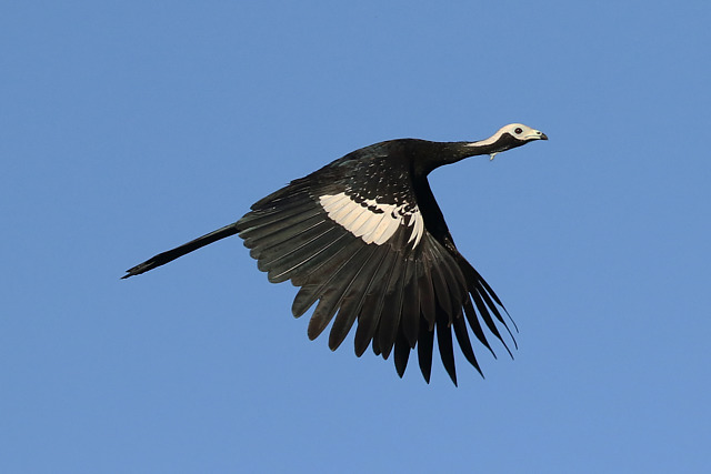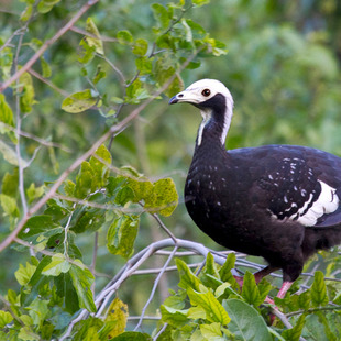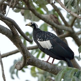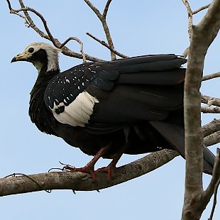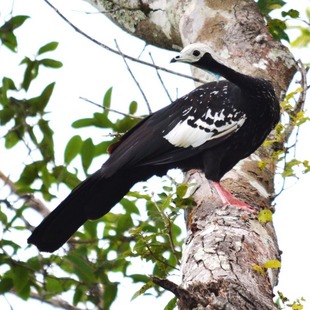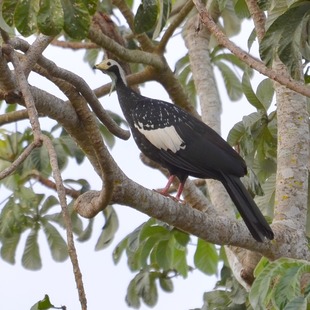 Mede de 60 a 69 cm de comprimento,sendo menor que Aburria cujubi e pesa de 1,25 a 1,35kg. Grande ave negra, forte contraste com o branco dominante na cabeça e da asa, em especial voando. A barbela é cinza clara, quase branca, com uma estreita pele pendendo no centro. Também retrátil, como no gênero Penelope, mas sempre visível. As pernas, avermelhadas, são muito pequenas em proporção ao corpo.A cauda é longa e negra.