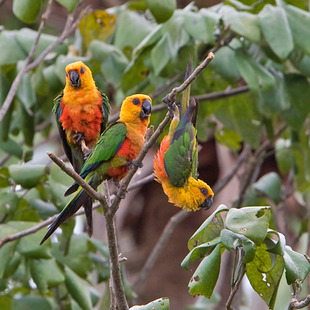 Imaturo tem cabeça e pescoço amarelo com marcações verdes; o peito e ventre laranja pálido. (Juniper, 1998).