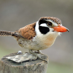 Mede cerca de 18 centímetros. A cabeça é grande em relação ao corpo, com os tons negros e cinza amarronzados fazem forte contraste as áreas brancas ao redor do olho e bico, de cor avermelhada. A coleira branca da nuca liga-se ao tom cinza claro das partes inferiores, em contraste com o dorso amarronzado. A cauda é longa e fina, com uma série de listras finas mais escuras. Pousado, quase não se vê os pequenos pés. Íris amarelada.