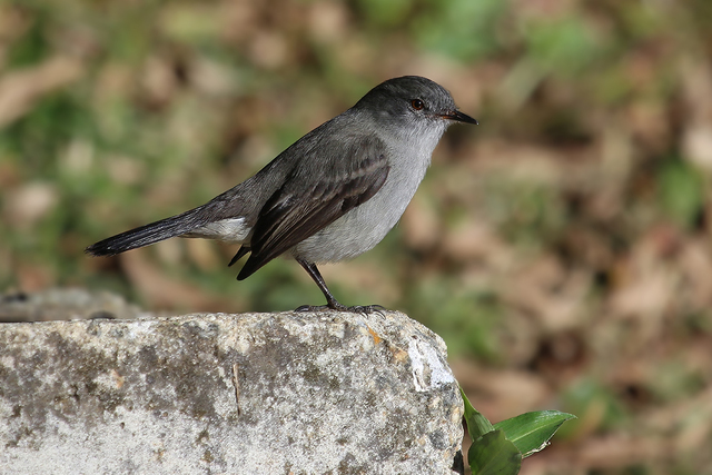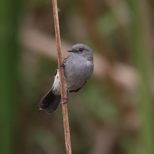 Mede até 12 cm de comprimento, com plumagem cinza-escura com a garganta mais clara, asas e cauda negras.