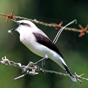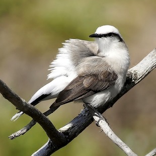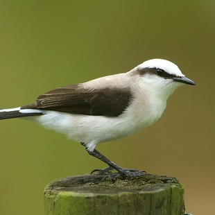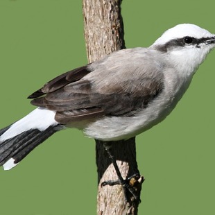 Sua coloração é principalmente branca contrastando com uma estreita faixa transocular preta que termina em uma leve curvatura para baixo logo após região auricular. A testa, coroa e nuca são brancas. O manto apresenta coloração clara levemente castanho-acinzentado. As asas apresentam coloração escura com tons castanho-acinzentado mais escuros que o manto. O uropígio e as penas supra-caudais são brancas. A cauda é preta e apresenta as porção distal com manchas brancas. A garganta, peito, ventre, crisso e infra-caudais são brancos.