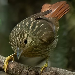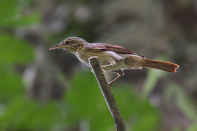 Mede 19 cm de comprimento. Partes superiores castanho oliváceo ricamente riscado de bege, algo semelhante a um arapaçu. Linha superciliar bege. Asas e cauda marrom avermelhados. Partes inferiores beges claras também riscadas mas com menos contraste que as costas. Garganta sem riscas.