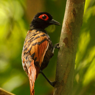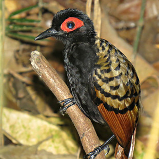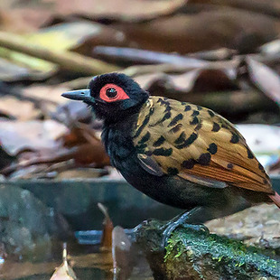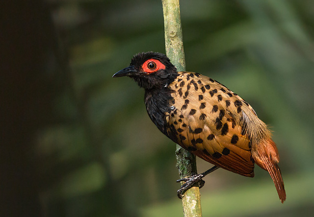 Mede de 17 a 18,5 centímetros e pesando 43 gramas. Ave de belo e complexo colorido, destacando-se um grande anel ocular vermelho em ambos os sexos. Cabeça, pescoço e partes inferiores negras. Partes superiores marrons, com grandes pintas em formato de gotas, na cor negra e ornadas de amarelo, em algumas ssp, podendo ser arredondadas e sem contorno em outras ssp. A cauda e asas em tons mais vermelhos.