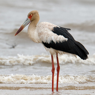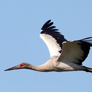 Mede até 1,4m de altura com uma envergadura de mais de 2m. Pesando até 4,5Kg. Possui plumagem branca, rêmiges, coberteiras superiores e cauda negras, região perioftálmica e base do bico nuas e vermelhas.