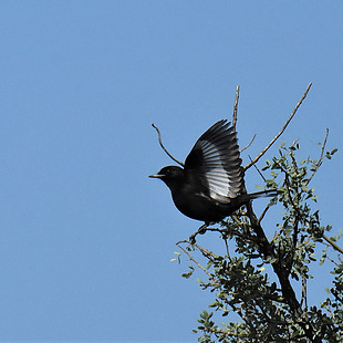 Mede 15,5 cm de comprimento. O macho da maria-preta-do-sul tem plumagem preto brilhante. Nas asas apresenta uma grande mancha branca sob as assas que atravessa as teias internas das rêmiges primárias. Esta faixa clara é bastante visível quando a ave está voando, mas isso pode passar despercebido quando o pássaro está empoleirado.