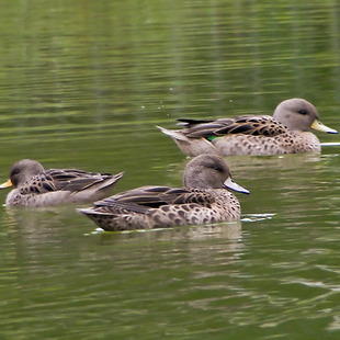 (Anas flavirostris) - Tamanho menor, cabeça redonda e marrom-acinzentada, faixa transocular escura, pescoço curto, flancos e crisso acinzentados sem manchas, espelho alar escuro com reflexos verdes e ladeado por duas faixas claras de coloração diferente, uma branca e outra ocre, cauda curta.