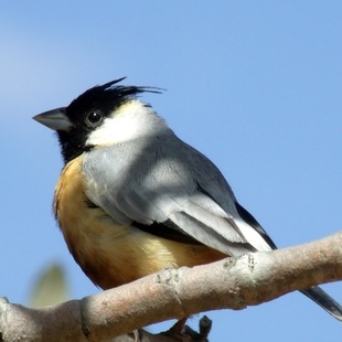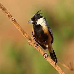 Mede cerca de 11,5 cm de comprimento. O macho apresenta uma crista preta contrastando com os lados da cabeça brancos, as partes superiores cinzas, asas e cauda pretas, e a garganta e o centro do peito pretos, em contraste com a barriga canela e a fêmea é amarronzada e sem o preto na garganta e no peito. Sua voz parece a de um inseto “tzi-tzi”.