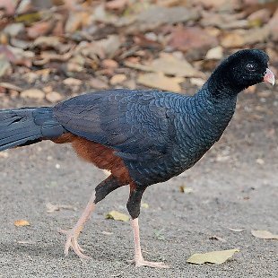 Seu tamanho é de 84 cm, possui penas negras, sendo as da região do ventre e a ponta das penas da calda de tons castanhos. Suas pernas e pés são avermelhados.
