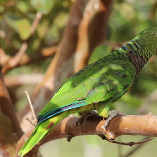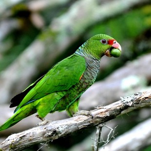 Chega a medir até 35 centímetros de comprimento, de plumagem arroxeada no peito, com aspecto escamoso e uma gola de penas alongadas, loros, fronte, base do bico, encontro e espelho alar vermelhos. Longevidade: 30 anos. Maturidade: 2 anos.