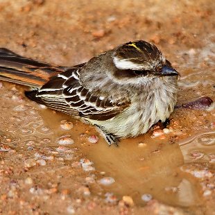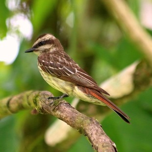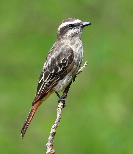 Mede cerca de 18cm. A plumagem, toda rajada de cinza escuro, lembra o bem-te-vi-rajado e o bem-te-vi-pirata. Seu tamanho é intermediário entre as duas espécies, tendo a cabeça e o bico mais proporcionais do que o bem-te-vi-rajado. Característica capaz de separá-la do bem-te-vi-pirata é o marrom avermelhado da base superior da cauda e os bordos da mesma cor das penas caudais.