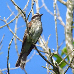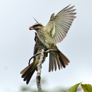 Seu canto é um chamado abafado, emitido em pousos tradicionais na copa. Também usados para caçar insetos em vôo, retornando para comer a presa nos poleiros.