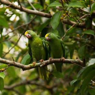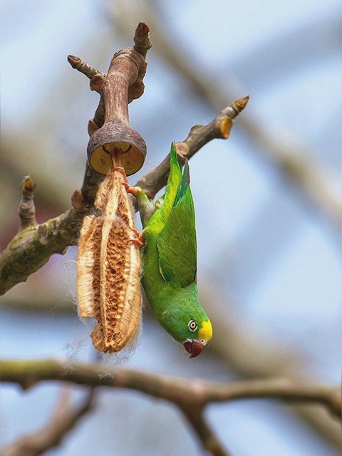 Muito comum em povoados e cidades ribeirinhas onde chega em grandes bandos para passar a noite. Habita florestas úmidas em matas inundáveis, bordas de floresta, clareiras e áreas urbanas, até 300 m. Visita palmeiras na beira de rios. Aparentemente sedentário.