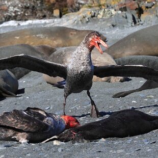 Estes petréis são predadores de outros vertebrados e carcaças de aves e mamíferos marinhos são avidamente consumidas. É o única espécie da Ordem dos Procellariiformes a ocupar preferencialmente o nicho de predador e necrófago de mamíferos e aves, e um dos poucos a mostrar agilidade em terra. Nas Ilhas Geórgia do Sul pinguins são um item importante da dieta durante a reprodução (62 a 89% da massa consumida), assim como outros alimentos (especialmente petréis menores, krill, lobos marinhos, lulas e peixes).