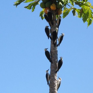 Voz: Bem distinta, um agudo “kirr-kirr-kirr” ( em vôo ); “girrä” ( pousado ). Gritam constantemente, comunicando-se entre si com um chamado alto e forte, enquanto viajam em longos vôos a grande altura. Tal grito costuma ser a primeira forma de detecção desse pica-pau.