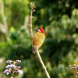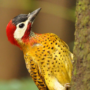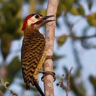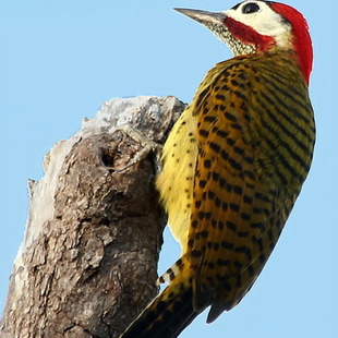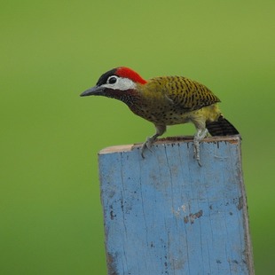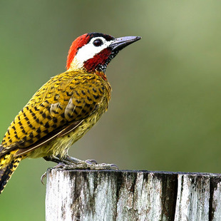 Possui em media 19 cm, sua nuca tem uma cor vermelha, a garganta é branca e preta toda pontilhada, a bochecha é avermelhada com preto, peito é verde com pontinhos pretos, a região do dorso tem um verde escuro com pontilhados em preto e a cauda é listrada em branco e preto na horizontal. Essa espécie possui dimorfismo sexual, a fêmea possui uma pequena diferença na bochecha e na nuca, onde, ao invés de ser vermelho com preto na bochecha, como o macho, é todo preto e o dorso vermelho, é menor.
