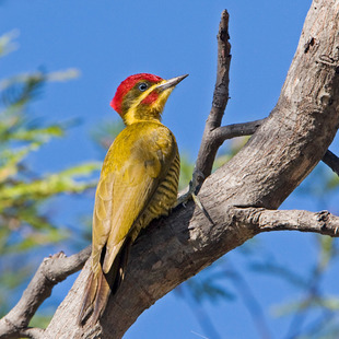 Machos e fêmeas apresentam coloração verde-olivácea no dorso, e amarela barrada em marrom-oliva no ventre. Em geral, os machos apresentam a plumagem da cabeça vermelha, enquanto as fêmeas, dependendo da subespécie, podem apresentar cabeça verde-oliva (tal qual o dorso) ou amarela. Indivíduos dos dois gêneros apresentam uma faixa amarela que vai do loro até a nuca, mas apenas nos machos observa-se estria malar vermelha. A íris pode ser branca ou azul, o bico é cinza escuro e as pernas são coloridas de oliva.