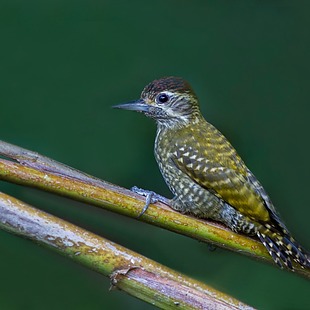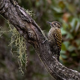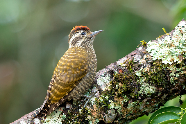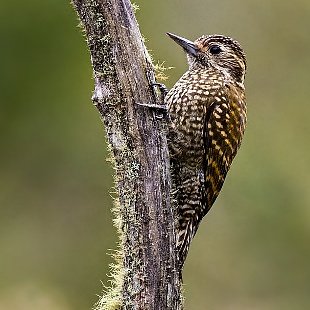 Com cerca de 17,5 centímetros, é o maior de um grupo de pequenos pica-paus esverdeados. Cabeça pardo-escuro, com o vértice avermelhado no macho; duas linhas brancas no lado da cabeça. Partes superiores marrom-esverdeadas, barradas de amarelo-esverdeados; partes inferiores pardacentas, manchadas de preto.
