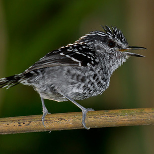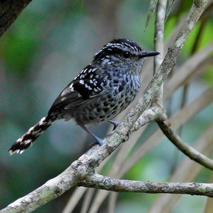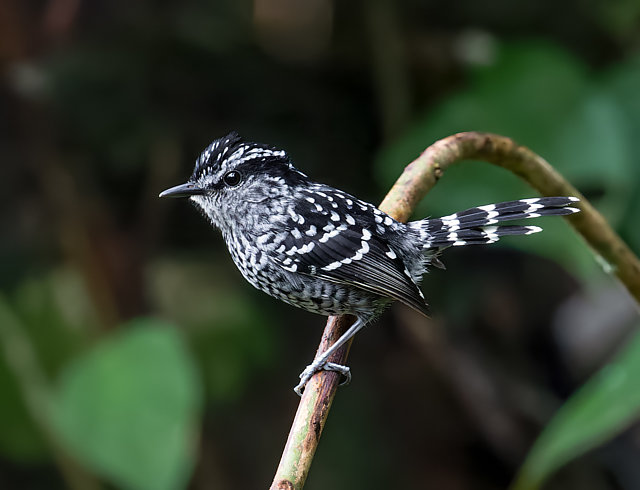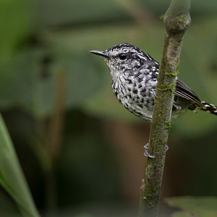 Medindo 11 cm, é uma espécie de plumagem inconfundível. O macho é preto com a parte superior com manchas brancas e o supercílio branco. Possui ainda duas barras brancas nas asas e a calda conspicuamente barrada de branco. A parte inferior é branca com manchas pretas em destaque. A fêmea possui um padrão similar mas o preto é substituído por marrom e o branco por amarelo esbranquiçado.