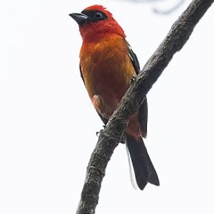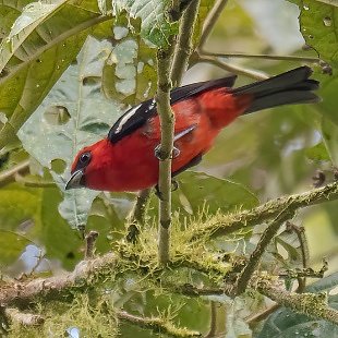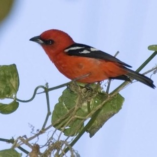 Cor vermelho sangue,asas negras com manchas brancas.Aproximadamente 16 cm.