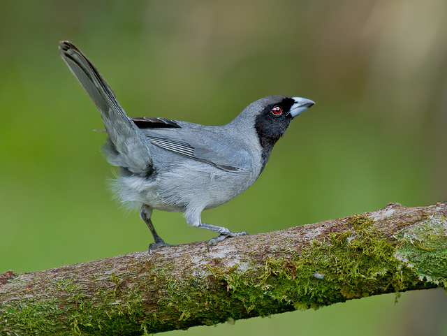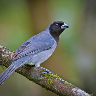 Tem cerca de 18 centímetros. É uma ave de corpo cinzento, cabeça, garganta e pescoço negros. Quando jovem sua cor é verde-olivácea. Gorjear suave e mavioso. Apresentam dimorfismo sexual. A fêmea possui plumagem verde-olivácea.