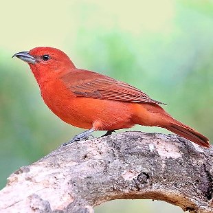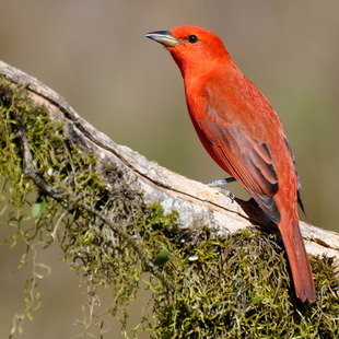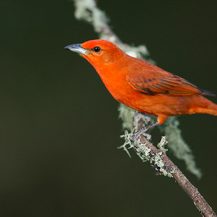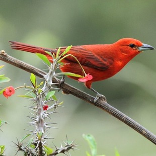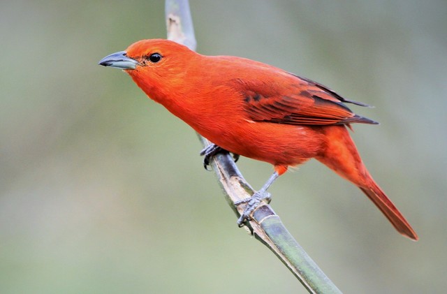 Mede cerca de 17,5 centímetros e pesa cerca de 38 gramas (macho). De acentuado diformismo sexual, o macho é facilmente identificado pelo colorido vivo quase que totalmente carmim, cambiando para pardacento nas partes superiores. A fêmea é de lado inferior amarelo vivo. O macho imaturo é de plumagem mista verde e laranja, permanecendo assim por um ano.