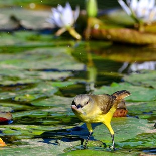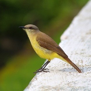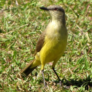 O peito é amarelo, a garganta clara, a cabeça cinza e as partes superiores marrons. Essa coloração lembra a de muitas outras espécies da família Tyrannidae. Mede cerca de 18cm. As patas são compridas o que ajuda a identificá-lo.