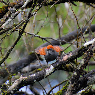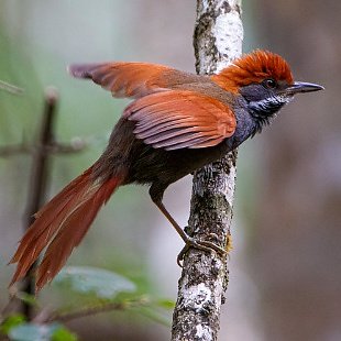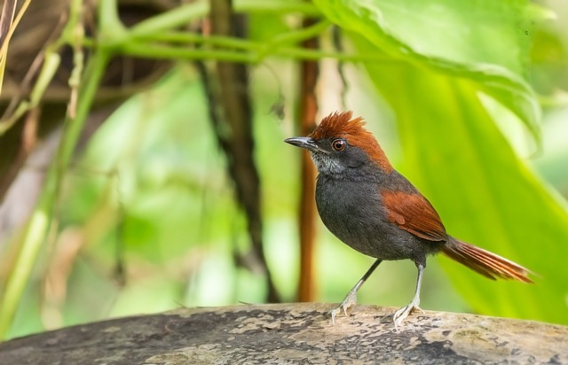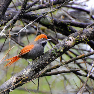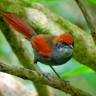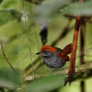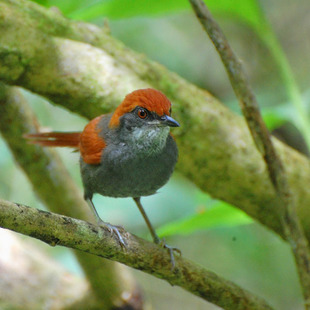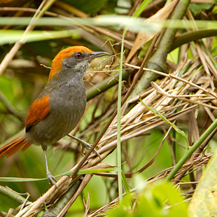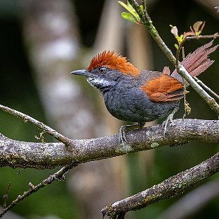 Mede 18 centímetros. Apresenta plumagem predominantemente cinza e escura, com capuz, asas e caudas ferrugíneas.
