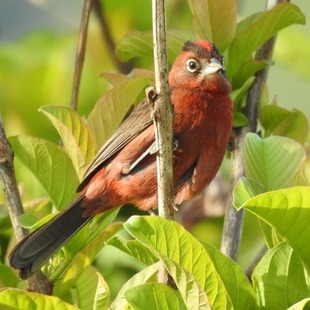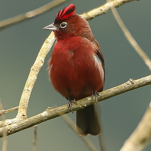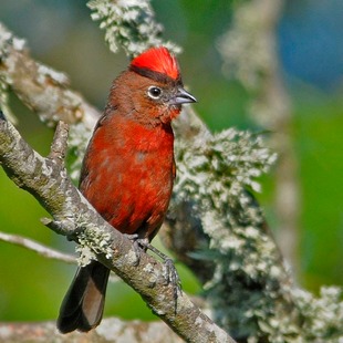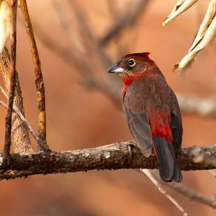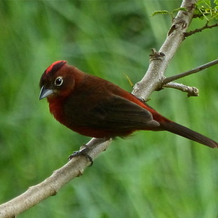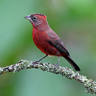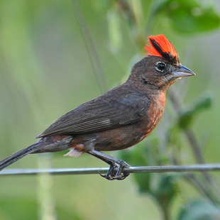 Medindo cerca de 13,5cm, tem tamanho semelhante ao do pardal, mas com coloração marrom escura na parte superior e vermelha nas partes inferiores e na cabeça, especialmente no macho, que apresenta uma coloração intensa e um topete vermelho com uma faixa negra. Ambos os sexos apresentam uma linha branca circundando os olhos. A coloração das fêmeas não tem tanto brilho e são mais pardacentas.