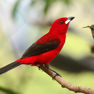 A plumagem do macho é de um vermelho-vivo, que deu origem ao nome. Parte das asas e da cauda são pretas. A espécie apresenta dimorfismo sexual, sendo a plumagem da fêmea menos vistosa, de cor parda nas partes superiores e marrom-avermelhada nas inferiores.