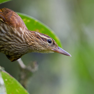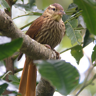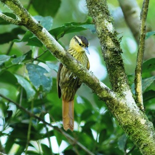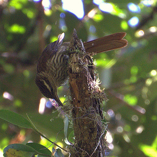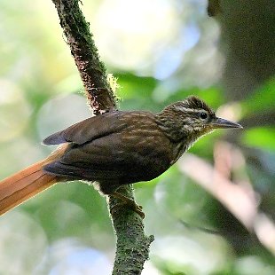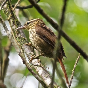 Furnarídeo com cerca de 20cm, muito característico pelo intenso desenho rajado das partes inferiores, que lembra o de dendrocolaptídeos com Lepidocolaptes. Sua voz é um forte chamado “krip” rasgado (Sick, 1997).