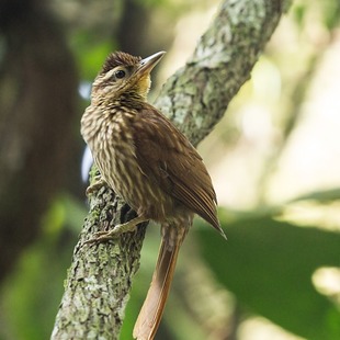 Furnarídeo com cerca de 20 centímetros, muito característico pelo intenso desenho rajado das partes inferiores, que lembra o de dendrocolaptídeos como Lepidocolaptes. Sua voz é um forte chamado “krip” rasgado (Sick, 1997).
