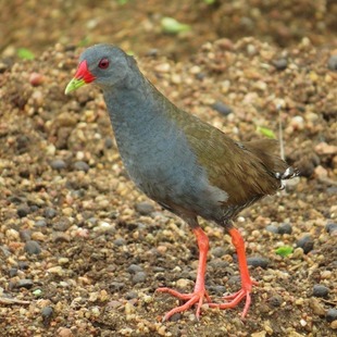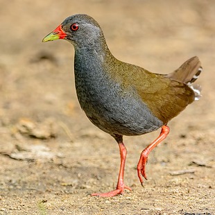 Mede cerca de 19 cm de comprimento .É uma espécie que apresenta coloração acinzentada no rosto e no peito, apresenta forte barrado de preto e branco no ventre inferior, crisso e na parte inferior da cauda. O manto e as asas são marrons. A cauda é curta e apresenta a mesma coloração do manto. Os pés são vermelhos brilhantes e o bico é bicolor, vermelho e amarelo-esverdeado. Olhos avermelhados.