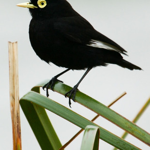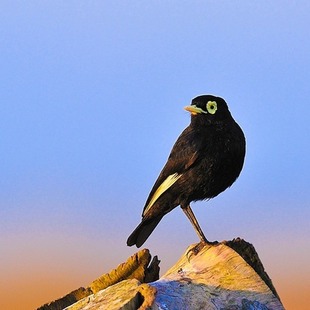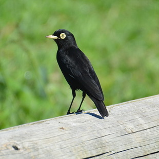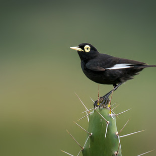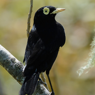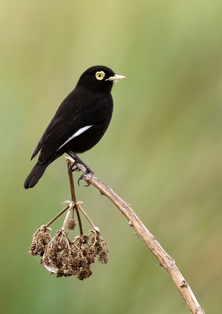 Mede entre 13 e 16 centímetros de comprimento. O macho apresenta plumagem de coloração quase totalmente preta, com as rêmiges primarias com bela coloração branca que é melhor observada quando a ave se apresenta em voo. A face é preta com extensa área nua revestida por uma pele amarela ao redor dos olhos que tem a íris amarela. O bico é claro, de coloração amarelada e os tarsos e pés são escuros, quase pretos.
