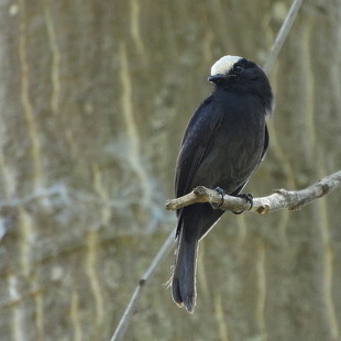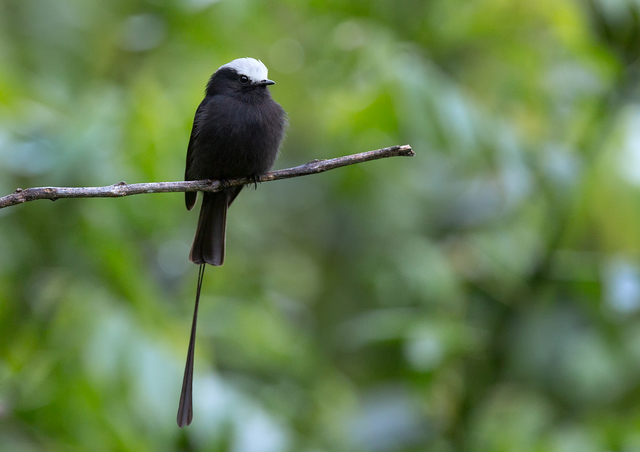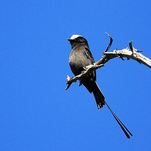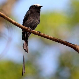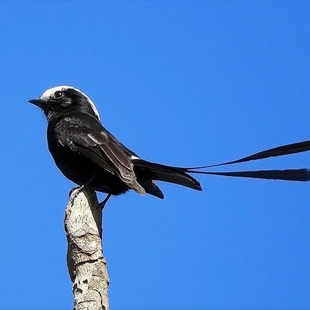 O contraste entre o negro do corpo e o branco do alto da cabeça é exclusivo desta espécie. Quando voa, é possível ver a grande área branca nas costas, antes da cauda. As duas penas centrais da cauda são muito longas (chegam a 10cm nos machos) e destacam-se pelo comprimento e pelo alargamento nas pontas. As fêmeas possuem-nas menores, embora seja necessário observar o casal junto para ter certeza dos sexos.