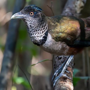 Características: Lados da cabeça inclusive bochechas e as regiões auriculares, cortados de faixas pretas, sobre o fundo branco-arruivado. Píleo (alto da cabeça) com dois terços anteriores revestidos de penas escuras orladas de debrum cor de ferrugem (e com uma pequena nódoa medial da mesma cor). Contrasta um penacho nucal azul com mescla de verde na base das penas. Dorso e penas coberteiras superiores das asas de colorido verde-bronzeado, sem mescla distinta de azul. Rêmiges (penas de voo) primárias escuras com barba externa listrada de verde-bronze. Baixo dorso castanho, mesclado de verdoengo e cauda verde-bronzeada com fraca mistura de cobre. Lados da cabeça, bochechas, garganta e alto do peito pardos-esbranquiçados, com as penas cortadas de faixas arciformes (em forma de arco) escuras, dando ao conjunto um aspecto escamoso. Abdômen cinzento-escuro puxando para o pardo. Crisso (região em volta da cloaca) tingido de castanho. Penas da mais baixa porção do peito largamente debruadas de negro, formando uma faixa transversal no limite com o abdômen. Bico amarelado, com base pardo-azulada e pés cinzento-plúmbeos (cor de chumbo), conforme descrição de Temminck, 1820.