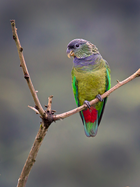 A coloração geral da ave é verde, sendo a porção dorsal verde escuro e a porção ventral verde amarelado. Apresenta a cabeça cinza-azulada, abaixo do pescoço tem uma faixa roxa, bico amarelado, asas verdes, crisso e infracaudais vermelhos.