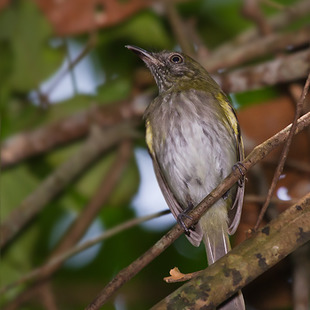Apresenta os lores e a região auricular de coloração cinza claro. Em torno do olhos claros, apresenta conspícuas penas que formam uma delicada franja branca ao redor dos olhos. A coroa, manto, asas e cauda são de coloração verde oliva. As coberteiras das asas apresentam as bordas levemente amareladas, produzindo duas barras alares claras. As penas rêmiges apresentam bordas pálidas de coloração amarelada. Garganta cinza esbranquiçada com finas estrias cinzas. Peito cinzento levemente manchado de branco, e tingido de amarelo nas laterais. O ventre e o crisso são esbranquiçados, flancos e sub-caudais na coloração amarelo pálido.