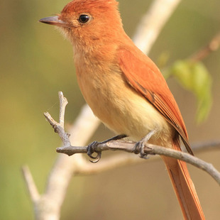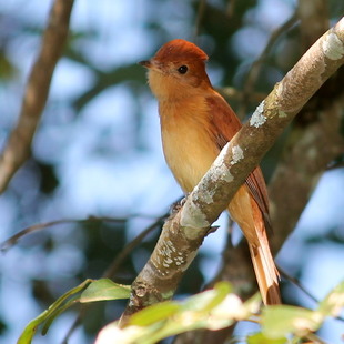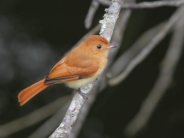 O adulto mede 18 cm. Ave que lembra uma espécie do gênero Myiarchus por sua postura ereta e por deixar as penas da cabeça semi-eriçadas. O tom avermelhado da plumagem é a característica principal. Tal cor destaca o pardo amarelado da região ventral, especialmente na garganta e na barriga. Bico longo, negro, com uma larga base avermelhada (visível sob boas condições de luz).
