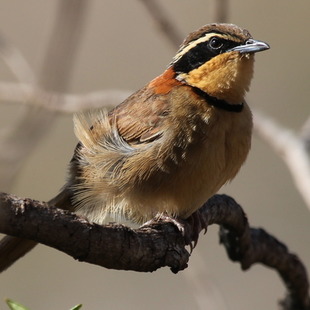 Pode ser facilmente identificado pelo seu colar negro que atravessa a região da garganta e pela sobrancelha branca logo acima de uma larga faixa negra sobre os olhos que se estende da base do bico até a nuca, a parte inferior é branco-amarelada e a costas ferrugíneas. Possui ainda uma mancha ferrugínea mais avermelhada na nuca que se estende até o colar negro nos lados do pescoço.