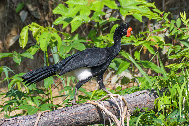 Mede de 82 a 89 cm e pesa cerca de 2,5 kg. Esta é a única espécie cujo macho tem um ornamento vermelho esférico acima e abaixo do bico. A fêmea tem uma cera vermelha e o ventre ferrugem. O macho é preto com ventre branco.