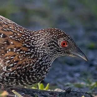 Sua plumagem é pardo-anegrada. Possui as partes superiores pintalgadas de branco. Tem o pescoço anterior estriado de branco, enquanto o resto das partes inferiores são transversalmente fasciadas. Sua íris é vermelha-alaranjada. Tarso, pés e bico são escuros.