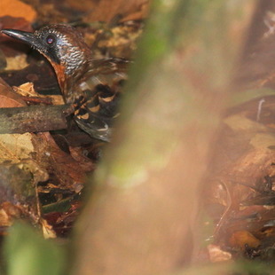 Pula (e não caminha) no solo, revirando as folhas mortas em busca de insetos, aparentemente não sendo atraído por formigas-de-correição.