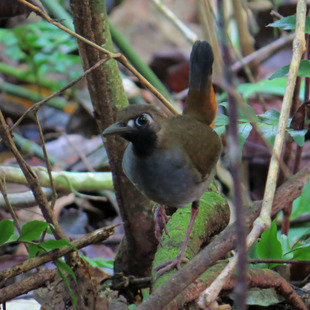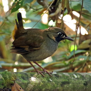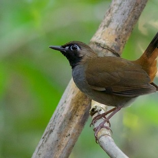Mede cerca de 18 cm de comprimento e pesa 57 g. Coroa e partes superiores marrons. Olhos escuros com um anel ocular azul claro, loros brancos. Garganta preta e peito cinza. A barriga é cinza clara e as laterais do corpo castanhas. Coberteiras inferiores da cauda em tons avermelhados. Cauda anegrada e curta, normalmente mantida ereta. Pernas claras e compridas.
