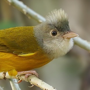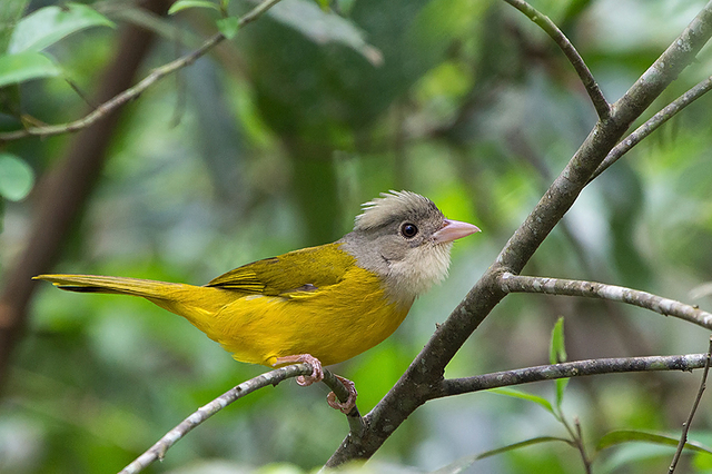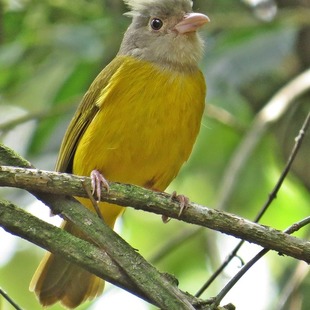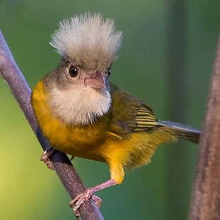 Mede entre 16 e 17 centímetros de comprimento e pesa entre 22,5 e 35 gramas. Pode lembrar uma fêmea de Tem-tem-de-dragona-branca (Lanio luctuosus), mas tem píleo amarelo. Oliva por cima, cabeça cinza-clara com crista arrepiada, bico róseo; garganta pardacenta, partes inferiores amarelas. Arrepia o topete quando canta e costuma manter a cauda entreaberta. O canto é uma sequência apressada e variada de notas agudas e abruptas.