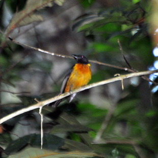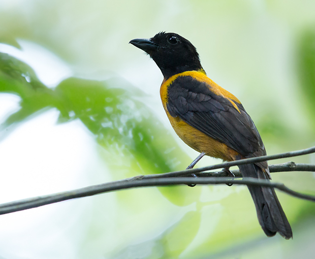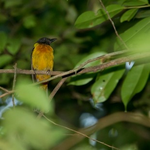 Mede aproximadamente 18 centímetros de comprimento. Macho com cabeça, asas e cauda negras. Restante da plumagem amarelada, com o peito manchado de laranja. Fêmeas com tons mais oliváceos nas partes superiores e mais ocráceos nas inferiores.