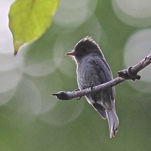 Mede cerca de 13 centímetros de comprimento e pesa entre 9 e 10 gramas. Apresenta coroa cinza escura com uma pequena mas perceptível crista. Lores ligeiramente mais pálidos com a coloração cinzenta. Demais partes superiores são uniformemente cinza escuro. As retrizes são enegrecidas. Asas enegrecidas levemente amarronzadas. Garganta, peito e ventre são cinza fuligem, sendo que a garganta é ligeiramente mais pálida.