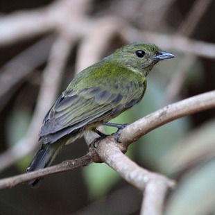 Mede cerca de 12 cm de comprimento. O macho é preto-brilhante e a fêmea é verde-escura nas partes superiores, garganta e peito, tornando-se verde-amarelada nas demais partes inferiores.