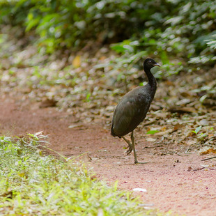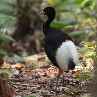 O jacamim-de-costas-verdes (Psophia viridis) ocorre na região entre os rios Madeira e Tapajós.