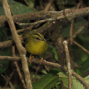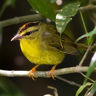 Mede 14 centímetros. Possui o corpo em tons oliváceos nas partes superiores e mais amarelos nas inferiores. O píleo é laranja margeado por duas faixas negras, uma de cada lado. Uma fina faixa escura na linha dos olhos. Asas sem marcas e pés rosados.